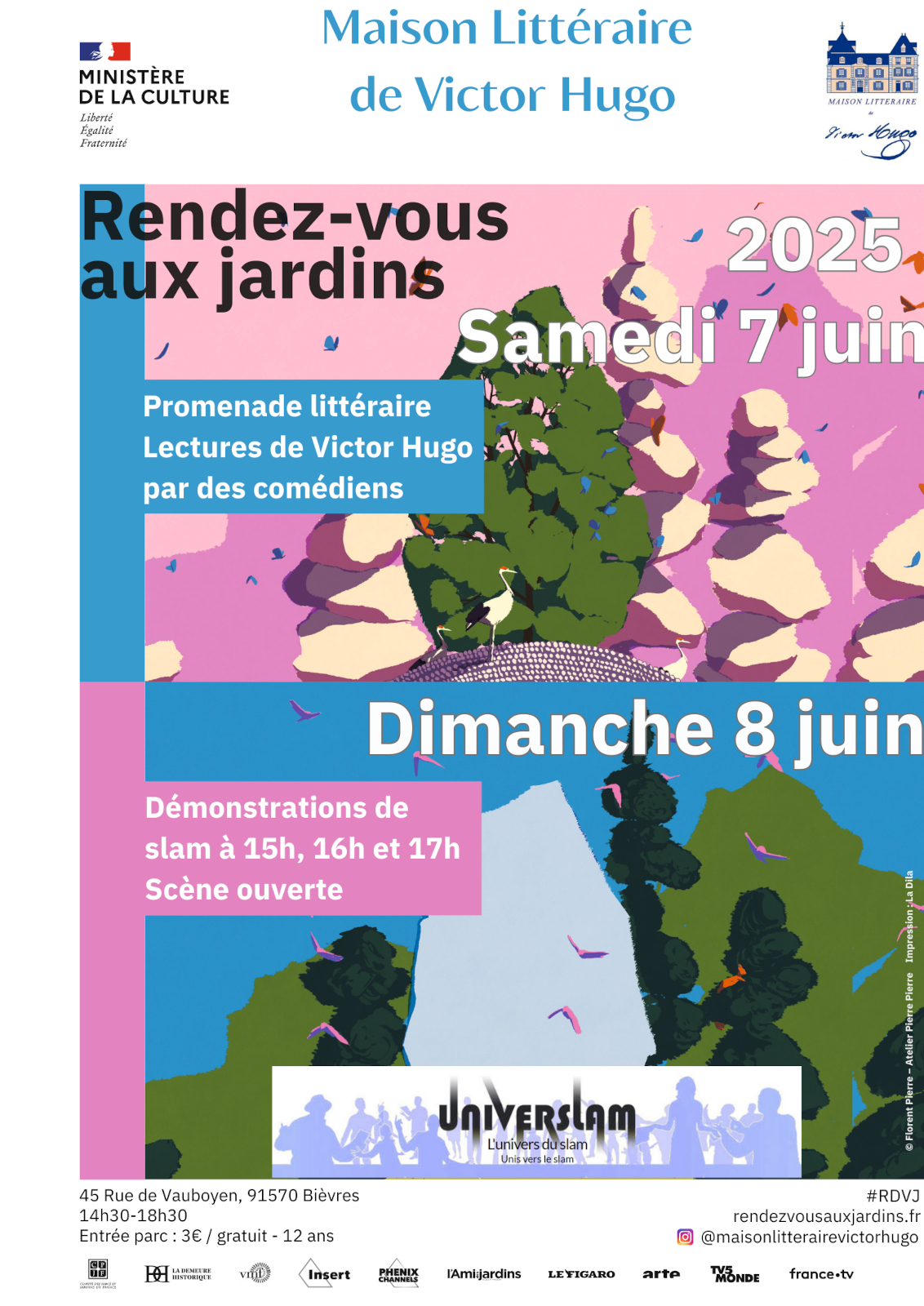 À 15h, 16h et 17h, des démonstrations de slam animées par King Bobo, Aladin, Michel Dréano, Orcy, Charles Piquion, Roz et Thinga, exploreront les thèmes essentiels abordés par Victor Hugo. Ces démonstrations seront suivies d’une scène ouverte (à tou.te.s) de slam et de poésie. L'engagement du grand écrivain du XIXe siècle pour l’abolition de la misère prendra vie à travers un art contemporain engagé.