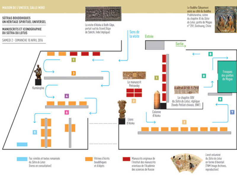 Dès l’entrée, le visiteur est accueilli par une reproduction du chapiteau aux lions, colonne érigée par le roi Ashoka à Sarnath, sur le site où la bouddha Shakyamuni prêcha son premier sermon. Tandis que la salle de gauche est consacrée aux sept paraboles majeures du Sûtra du Lotus.