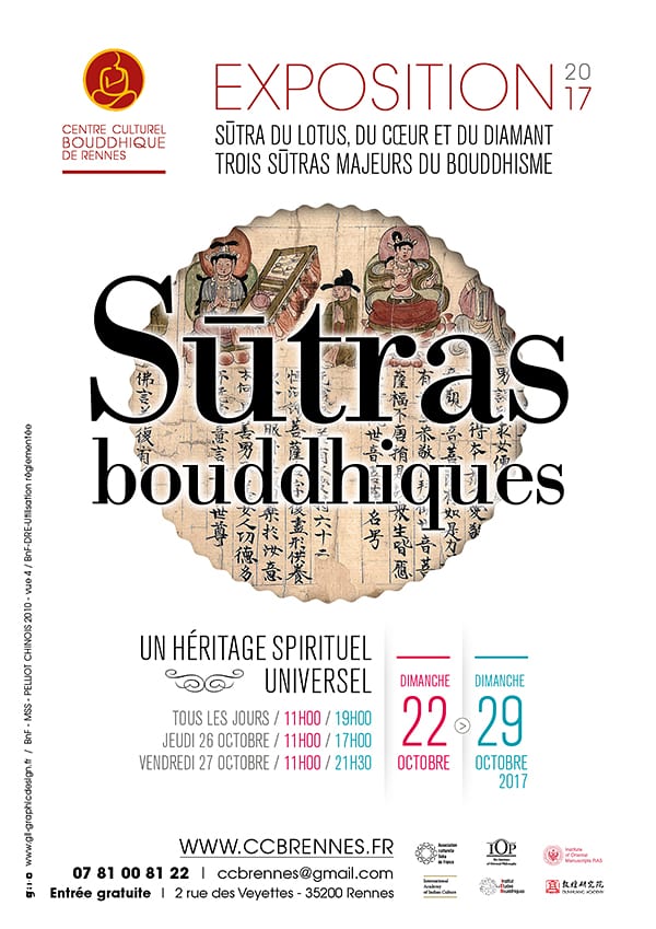 Sous-titrée « Sûtra du Lotus, du coeur et du diamant : trois sûtras majeurs du bouddhisme », cette exposition aura lieu au Centre culturel bouddhique de Rennes (CCBR) du 22 au 29 octobre 2017.