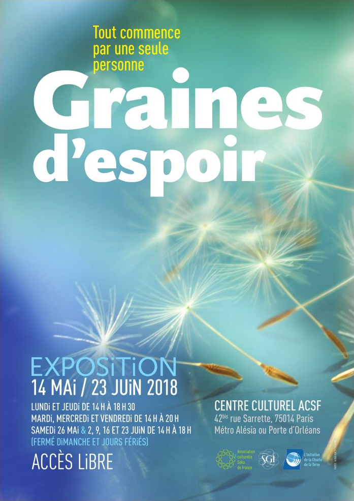Après le succès de cet événement en 2017, l’exposition « Graines d’espoir » réalisée par la SGI et l'Initiative de la Charte de la Terre, est présentée à nouveau à partir du 14 mai dans les locaux de l’ACSF, à Paris.