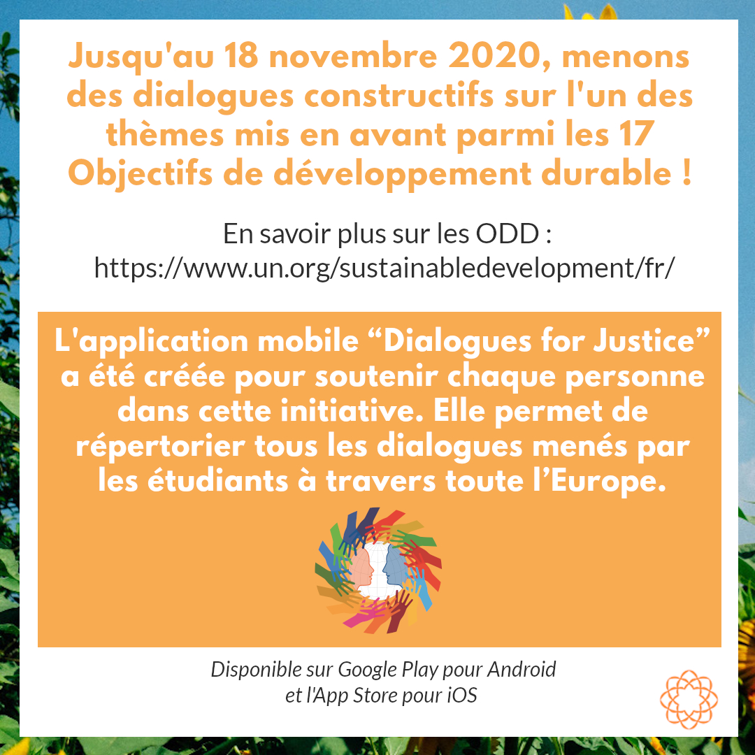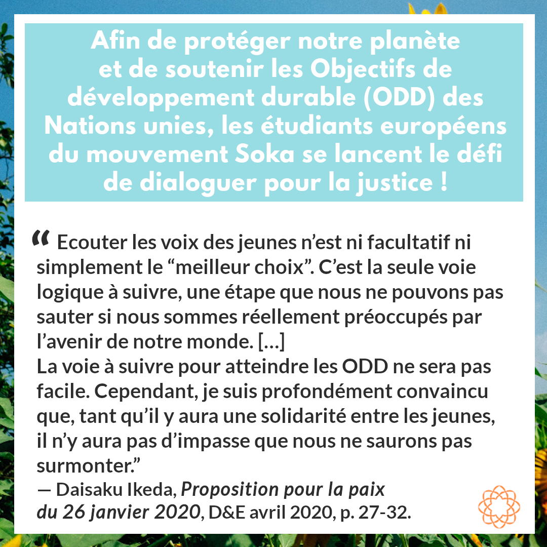 Les étudiants du mouvement Soka de toute l'Europe lancent l'initiative “Dialogues pour la justice”, jusqu'au 18 novembre 2020. Cette dynamique met en avant le pouvoir du dialogue afin de faire progresser la société civile vers la réalisation des 17 Objectifs de développement durable des Nations unies, à l'horizon 2030.