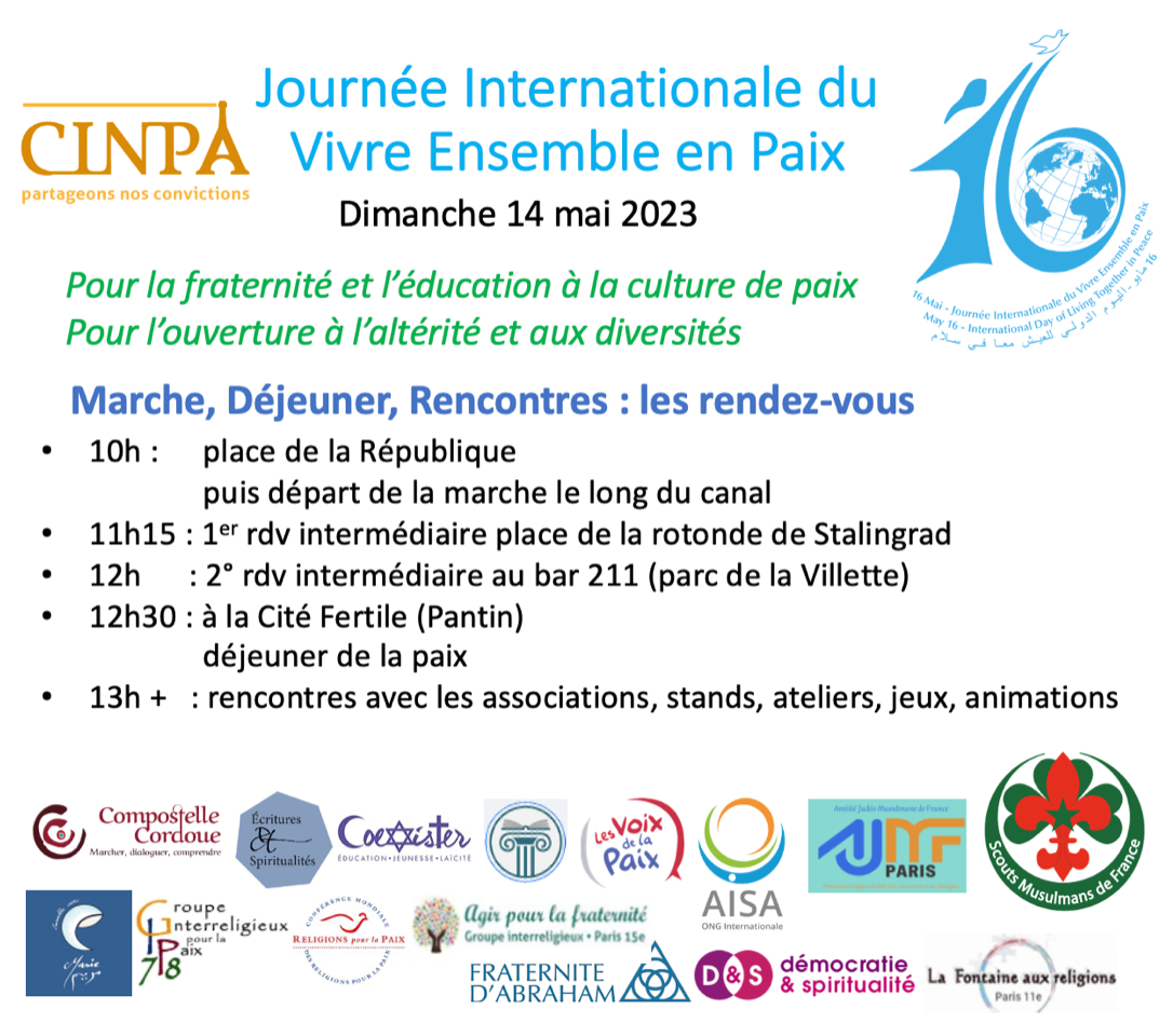 Rendez-vous dimanche 14 mai, à Paris, pour célébrer la Journée internationale du Vivre Ensemble en Paix, lors d'une grande manifestation organisée dans le cadre de la Coordination Inter convictionnelle du Grand Paris (CINPA), réunissant de nombreuses associations.