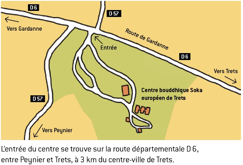 Accès : Centre bouddhique Soka européen, 1655 route de Gardanne, Campagne Longarel, 13530 Trets. L’entrée du centre se trouve sur la route départementale D 6, entre Peynier et Trets, à 3 km du centre-ville de Trets.
