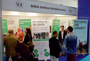 Lors du Sommet, la SGI a également présenté une exposition intitulée « Restaurer notre humanité », co-organisée avec le Asian Disaster Risk Reduction Network (ADRRN), à laquelle est venue Dr Jemilah Mahmood, sous-secrétaire générale de la Fédération internationale des Sociétés de la Croix-Rouge et du Croissant-Rouge (IFRC), en charge des partenariats. Elle a fait l’éloge de la SGI pour ses actions et souhaite que les partenariats entre le IFRC et la SGI se développent.