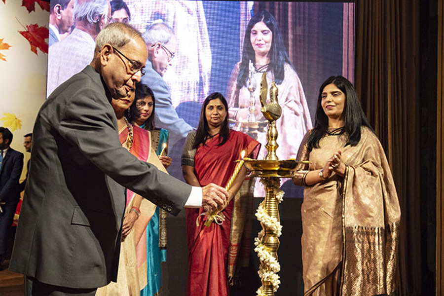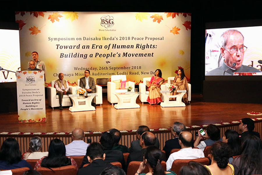 L’ancien président indien Pranab Mukherjee, invité d'honneur, a commenté : « J'ai été touché par une déclaration de Daisaku Ikeda, je cite : “Pouvoir contribuer d’une certaine manière au bonheur des autres et du monde, que ce soit par le travail ou par d'autres biais, apporte une joie et un accomplissement dans la vie.” Ces mots font écho au désir sincère de contribuer au bien-être de la société et témoignent d'un effort constant dans le cadre des propositions pour la paix annuelles couvrant les trente-six dernières années. » Il a appelé les jeunes de l'Inde à s'unir et à devenir la voix du changement afin de créer une société mondiale solidaire, dans laquelle personne n'est laissée pour compte.
