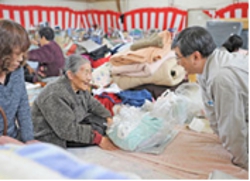 Itsuko Sudo, une autre évacuée résidant au centre, a dit qu’avoir le temps de prier au Centre l’a aidée à rester forte et à garder espoir face au désastre. Lors de la réunion, les responsables de la préfecture, Masahiko Endo et Masako Ishibashi, ont encouragé les participants en partageant l’esprit de Nichiren de « changer le poison en remède » ou transformer le malheur en une force positive de changement. Le 28 mars, quelques 30 croyants, contraints de quitter la zone touchée de Minamisoma et de se réfugier dans un abri à Nihonmatsu, ont tenu une réunion de discussion chez un pratiquant bouddhiste de la ville. Yuko Yamaguchi, une évacuée présente à cette réunion, a expliqué comment les encouragements chaleureux qu’elle avait reçus l’avaient déterminée à ne jamais être vaincue. Le 29 mars, Kazuo Nirasawa, responsable du mouvement Soka pour la région de Tohoku, Hidehiro Kato, responsable de la jeunesse de Tohoku, et Tomoyuki Sakurai, responsable du groupe de volontaires des jeunes hommes (groupe Soka) ont visité les endroits sécurisés de la ville de Minamisoma ainsi que le village Iitate en tant que membres d’une équipe de secours. Ils ont distribué de la nourriture et des biens de premier secours à de nombreuses personnes âgées, victimes de pénurie de ces biens de première nécessité.Le 2 avril, les responsables de Fukushima, M. Endo et Mlle Ishibashi se sont rendus dans des centres de réfugiés pour y encourager les croyants de la région.