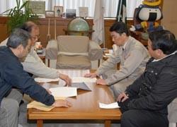 M. Morishima (fond à gauche) et M. Nirasawa (deuxième à partir de la gauche) rencontrent le gouverneur de la préfecture de Miyagi, Yoshihiro Murai (deuxième à partir de la droite) dans les locaux de la préfecture de Miyagi (15 mars).
