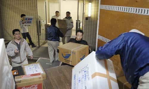 Des fournitures d’urgence sont distribuées au centre cultuel Soka d’Ishinomaki (15 mars).