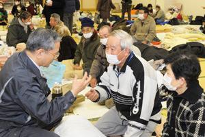 Le président du mouvement Soka au Japon, Minoru Harada (à gauche), encourage les personnes hébergées dans le Centre pour la Paix de Wakabayashi dans la ville de Sendai (17 mars).