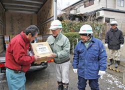 Nintei Kasai, (à droite) responsable préfectoral du mouvement Soka, charge des fournitures humanitaires (15 mars).