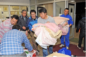M. Nintei Kasai, responsable préfectoral du mouvement Soka à Iwate, accompagné du responsable de la jeunesse M. Tetsuo Nagai, se sont rendus dans la ville côtière particulièrement touchée de Kamaishi pour livrer de la nourriture, de l’eau et autres produits d’urgence. En route, ils se sont arrêtés dans la ville de Tono pour récupérer des couvertures offertes par les croyants du mouvement Soka de Tono.