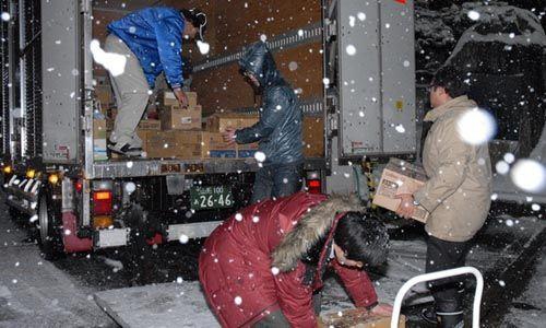 Les jeunes croyants de la préfecture de Yamagata sur la côte nord-ouest, qui a subi relativement peu de dégâts, ont collecté de la nourriture et des boissons, bananes, saucisses et thé, ainsi que des suppléments nutritionnels et des médicaments, et ont conduit des camions jusqu’à Sendai. Ils sont arrivés au centre culturel de Tohoku vers 2 heures du matin le 12 mars, après plus de quatre heures de route.