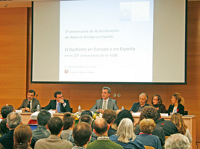 Le 17 novembre, un deuxième évènement a eu lieu : le colloque de la FCBE, commémorant le 5e anniversaire de la reconnaissance du bouddhisme comme une religion « connue et bien ancrée » en Espagne par le ministère de la Justice en 2007 ; ainsi que le 20e anniversaire de la fondation de la fédération. Des représentants de la SGI-Espagne et leurs homologues de treize autres organisations bouddhistes comptaient parmi les 200 personnes présentes.