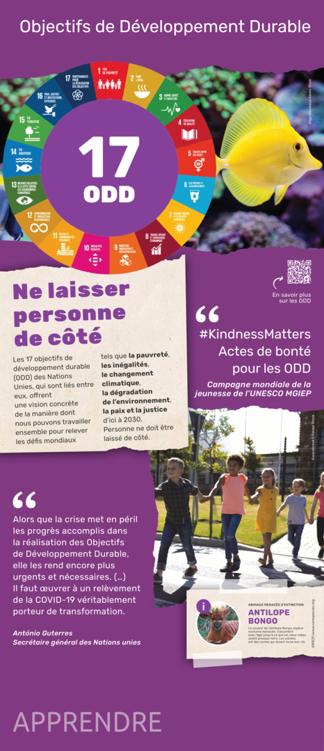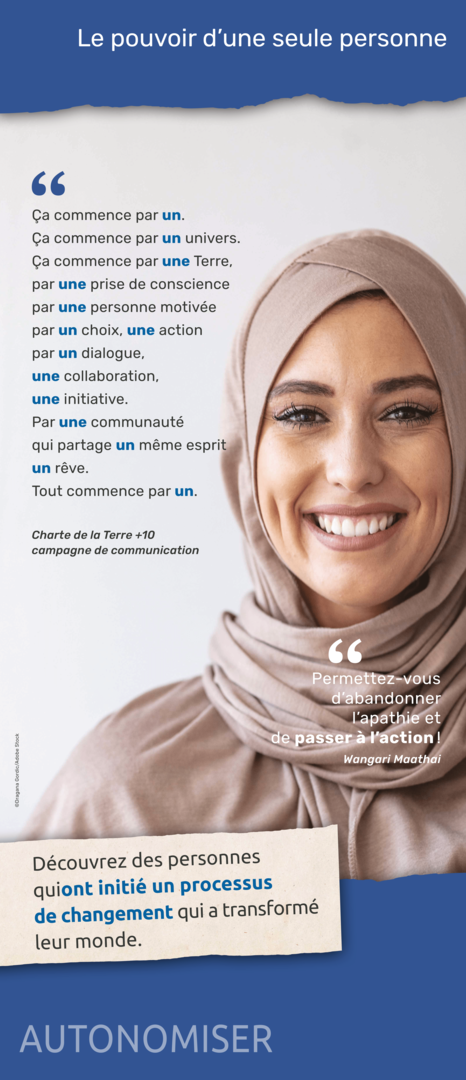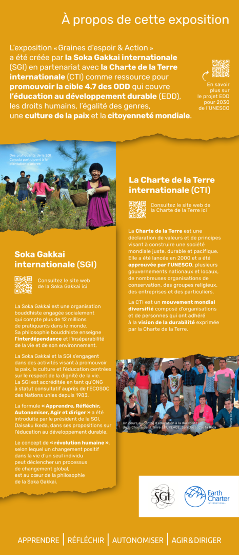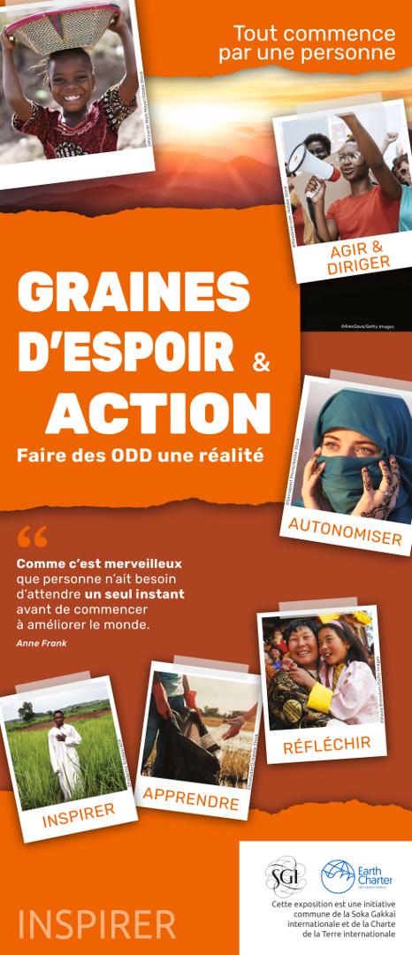 Nous vous présentons l’exposition « Graines d’espoir & Action » créée par la Soka Gakkai internationale (SGI), en partenariat avec la Charte de la Terre internationale (CTI). Elle constitue une ressource pour promouvoir la cible 4.7 des Objectifs de développement durable des Nations unies (ODD), couvrant l’éducation au développement durable, les droits humains, l’égalité des genres, une culture de la paix et la citoyenneté mondiale.